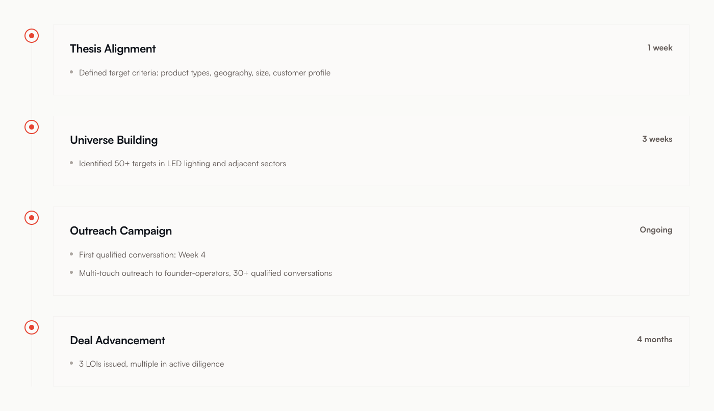 By month 4, the company had issued 3 LOIs and engaged in conversations with 30+ qualified acquisition targets. Total success fees paid: zero.